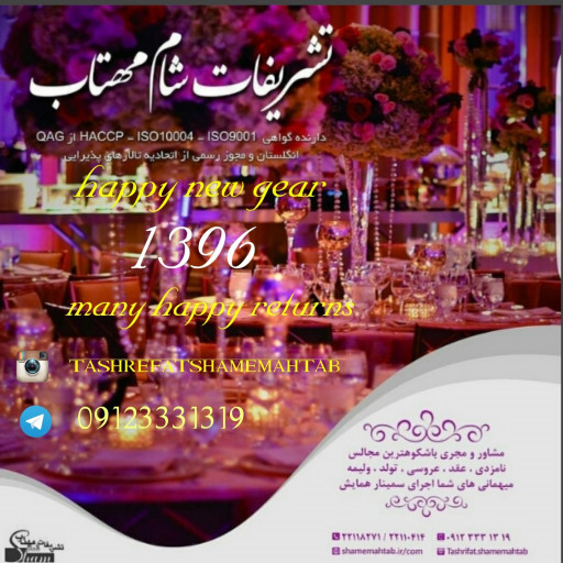 محیطی زیبا و غذایی خوشمزه را ازما بخواهید تشریفات شام مهتاب مشاور مجری باشکوهترین مجالس نامزدی عقد عروسی تولد ،ولیمه ،ومیهمانیهای شما-بیش از۵۰مورد باغ سالن جهت اجرای جشنهای شما،بهترین شب زندگیتان راباما سپری کنید ،هدیه مدیریت آرایش عروس در یکی از برجسته ترین سالنهای مطرح تهران، اجرای سمینار وهمایش تنها دارنده گواهی iso ۹۰۰۰۱-iso۱۰۰۰۴-HACCP از QAGانگلستان و مجوز رسمی از اتحادیه تالارهای پذیرایی ۰۹۱۲۳۳۳۱۳۱۹-۲۲۱۱۰۴۱۴-۲۲۱۱۸۲۷۱